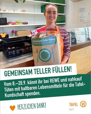 WeiterlesenDort kannst du in den nächsten 2 Wochen Tafel-Tüten spenden – entweder indem du eine Tüte an der Kasse bezahlst und abgibst oder eine Spendenkarte…