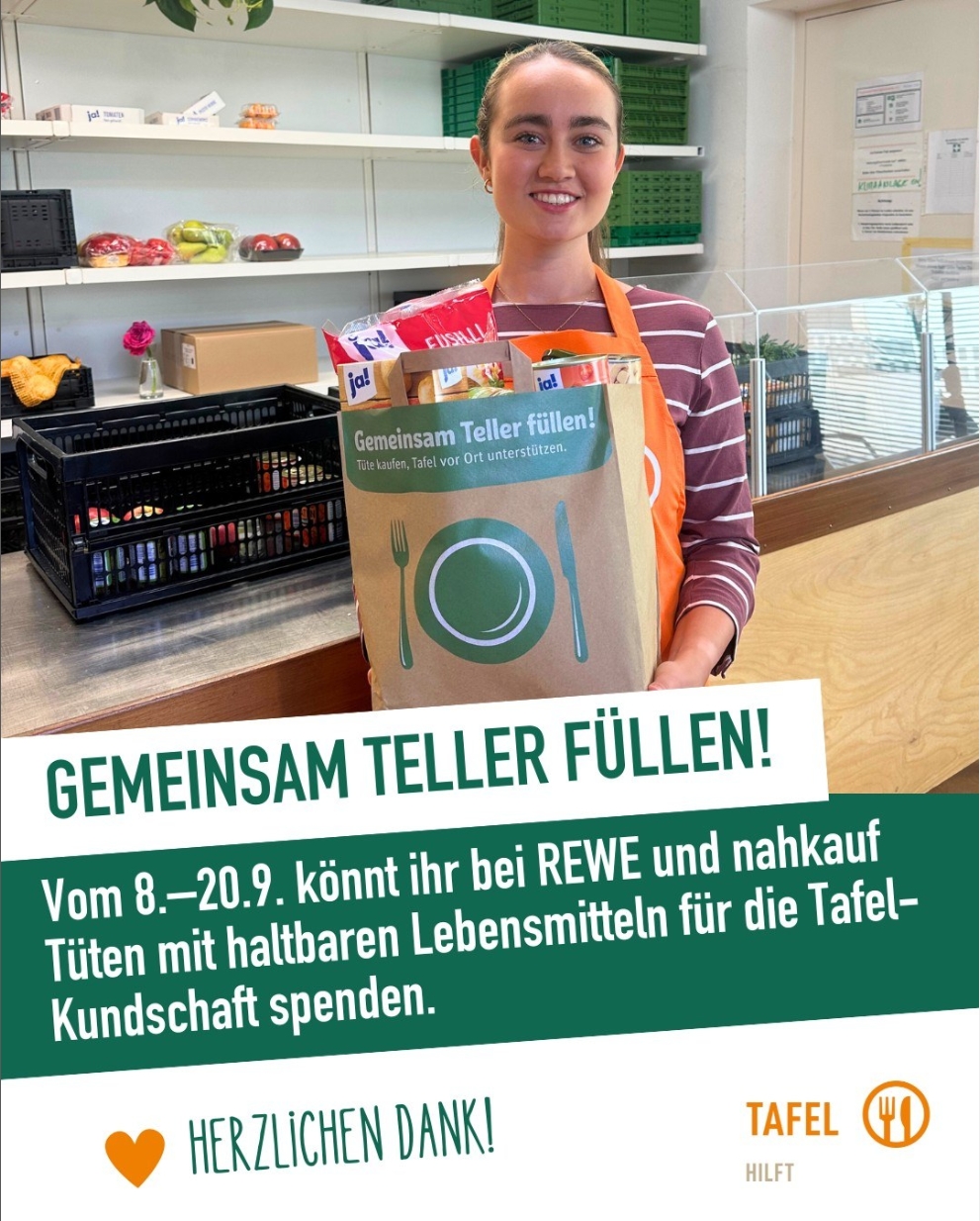 Dort kannst du in den nächsten 2 Wochen Tafel-Tüten spenden – entweder indem du eine Tüte an der Kasse bezahlst und abgibst oder eine Spendenkarte nutzt.